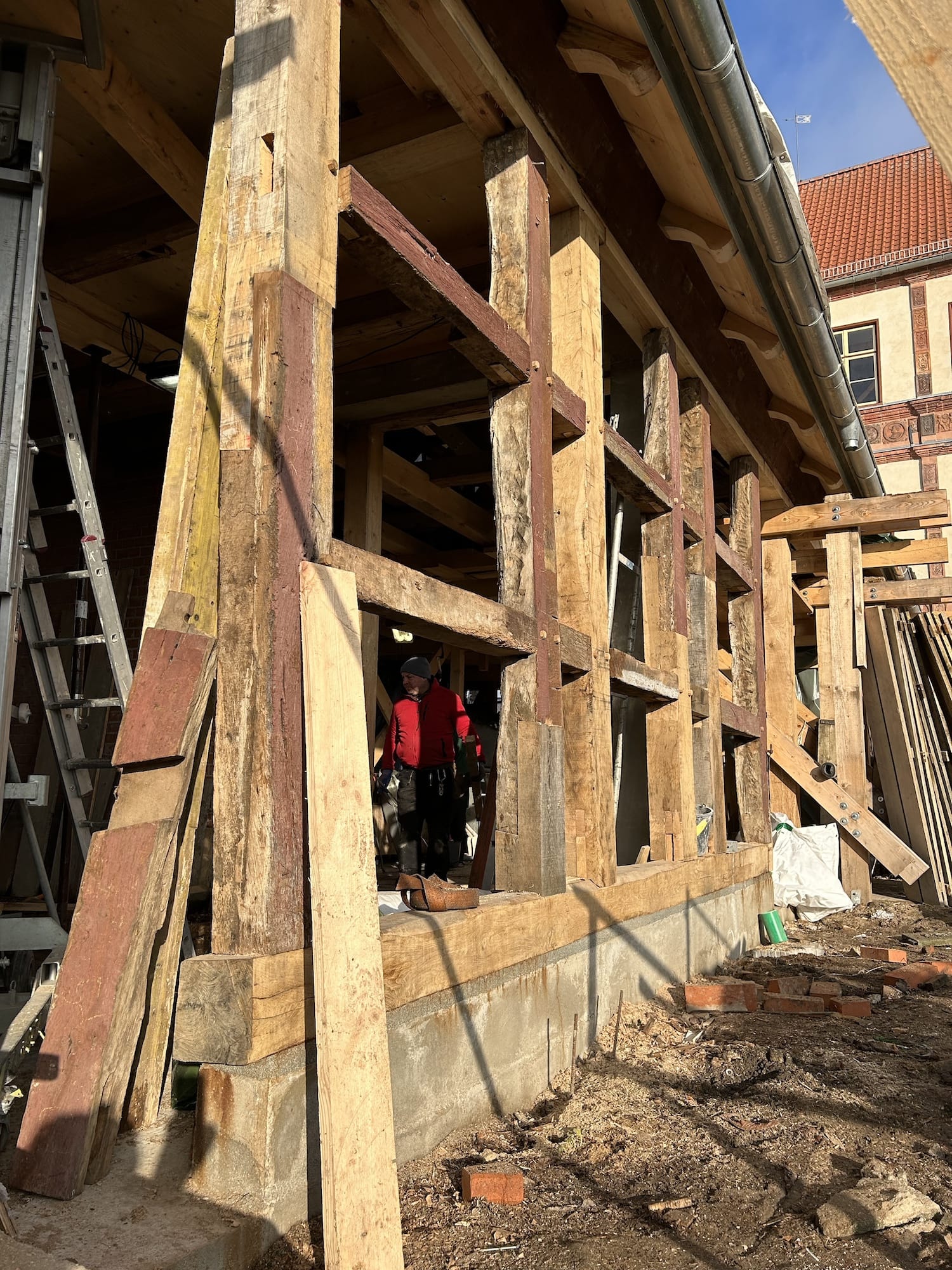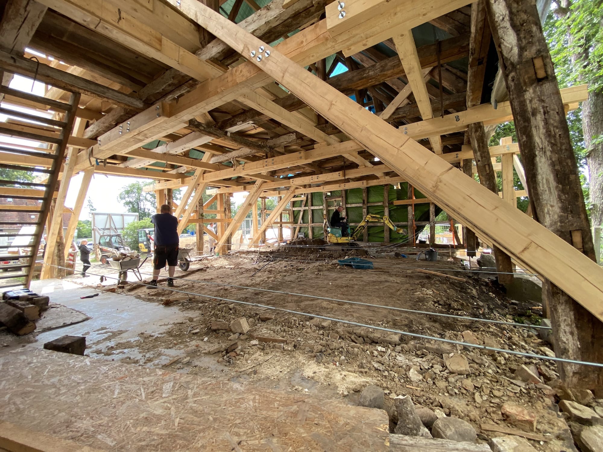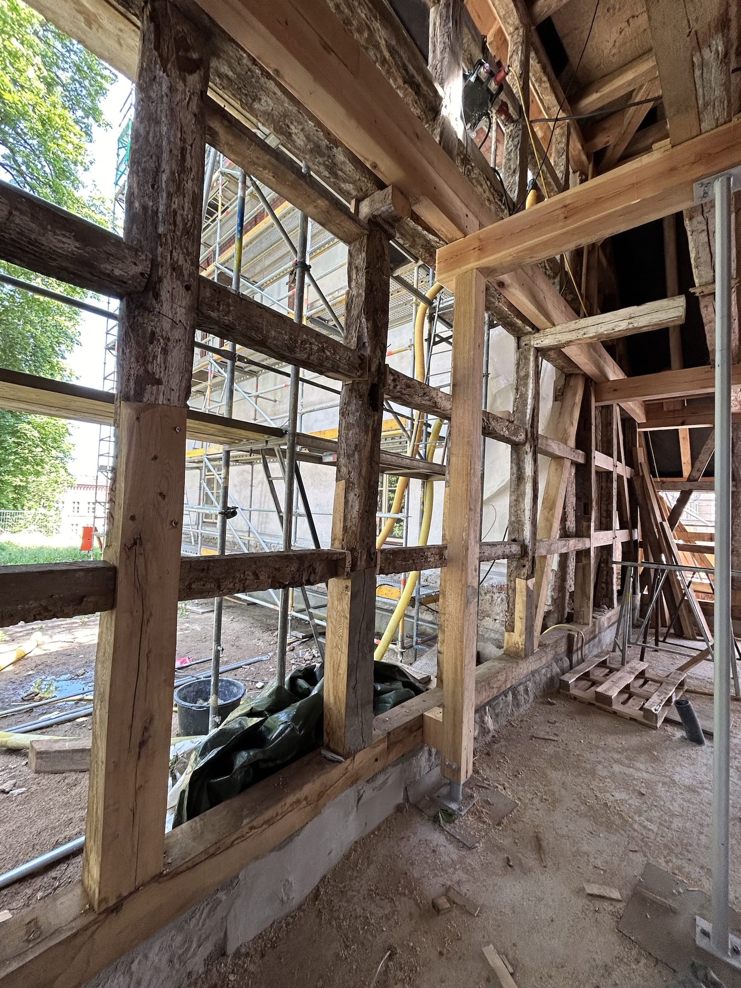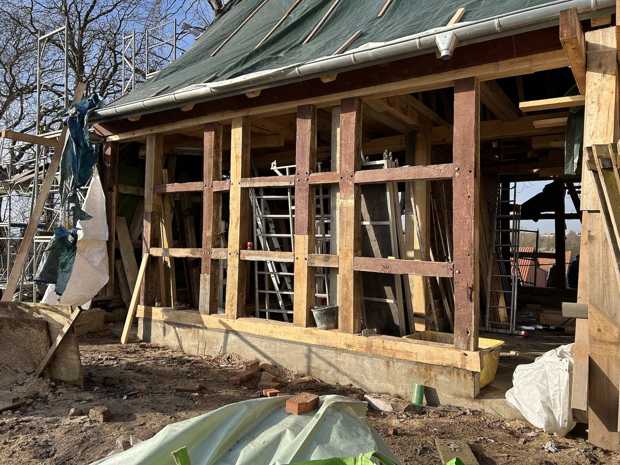 Vor Beginn der Bauarbeiten waren aufwändige statische Absteifungen der vorhandenen Fachwerkkonstruktionen, der Decke und des Daches zur Durchführung der Sanierungsmaßnahme mit einer separaten Gründung notwendig.