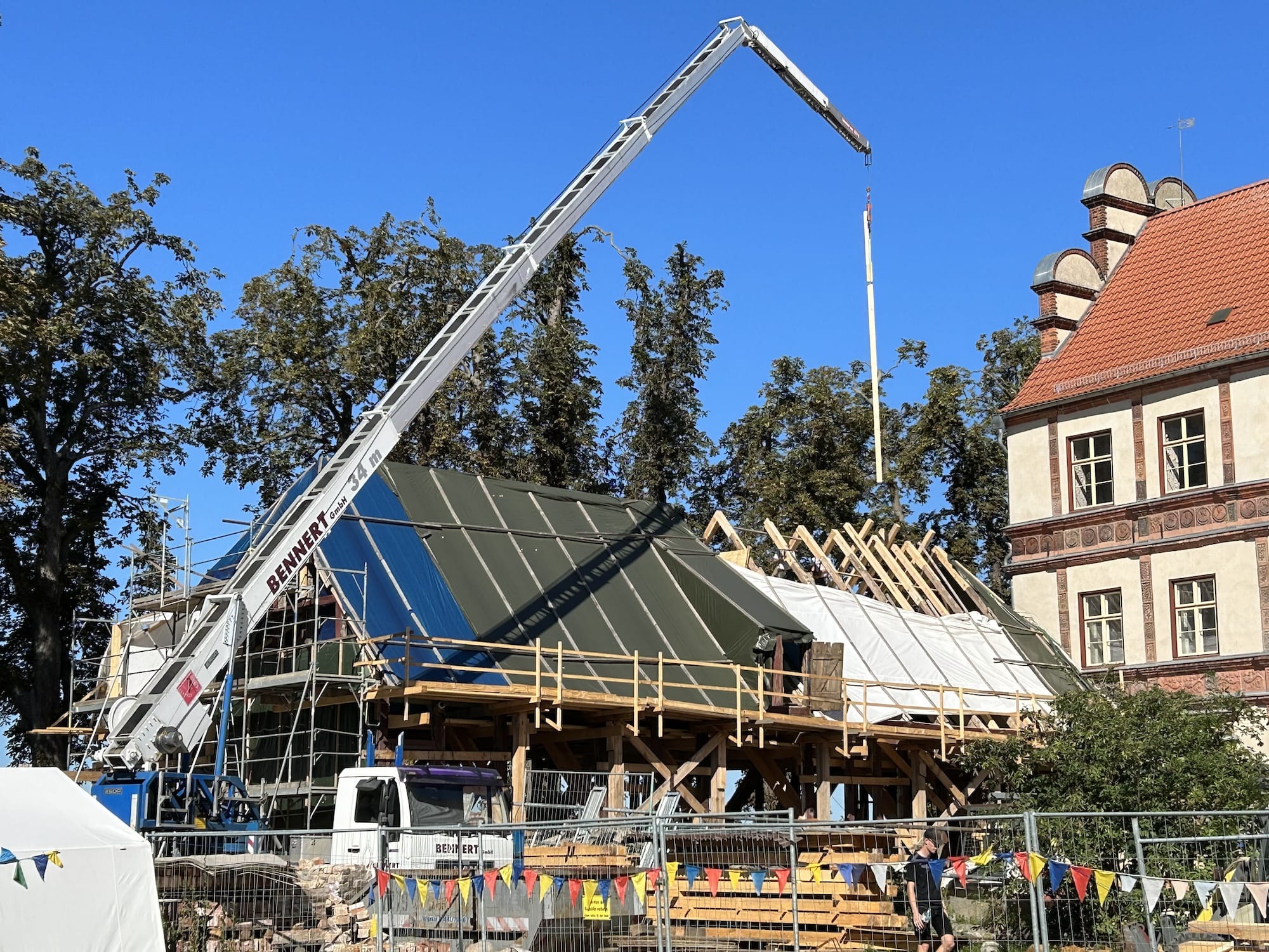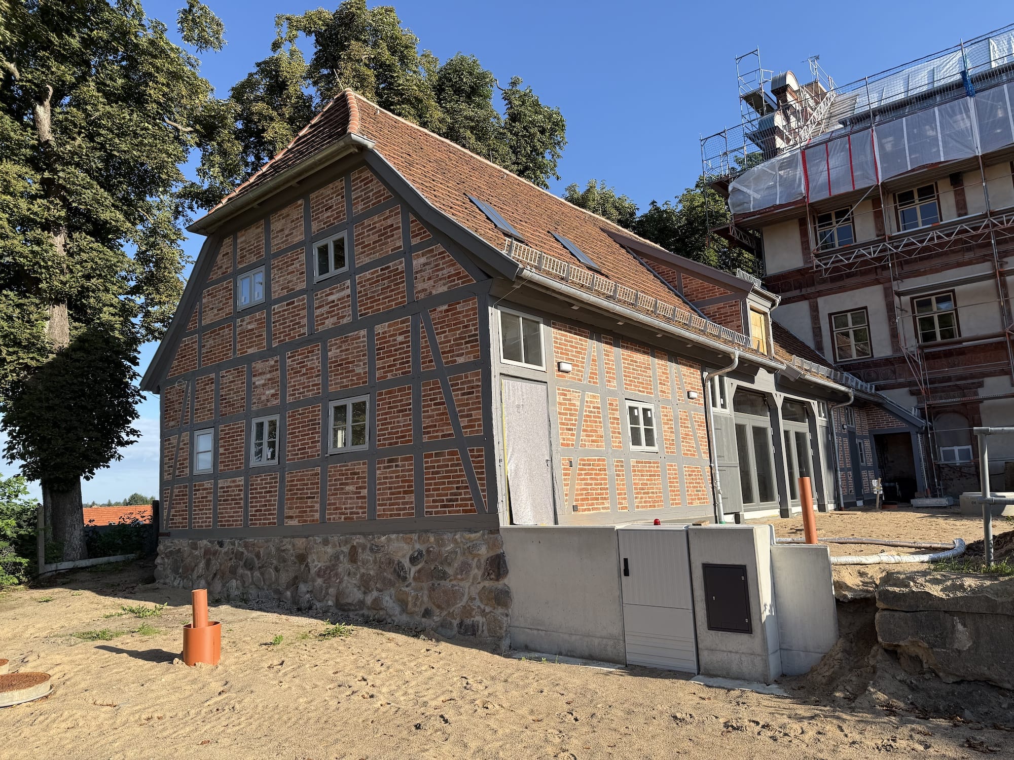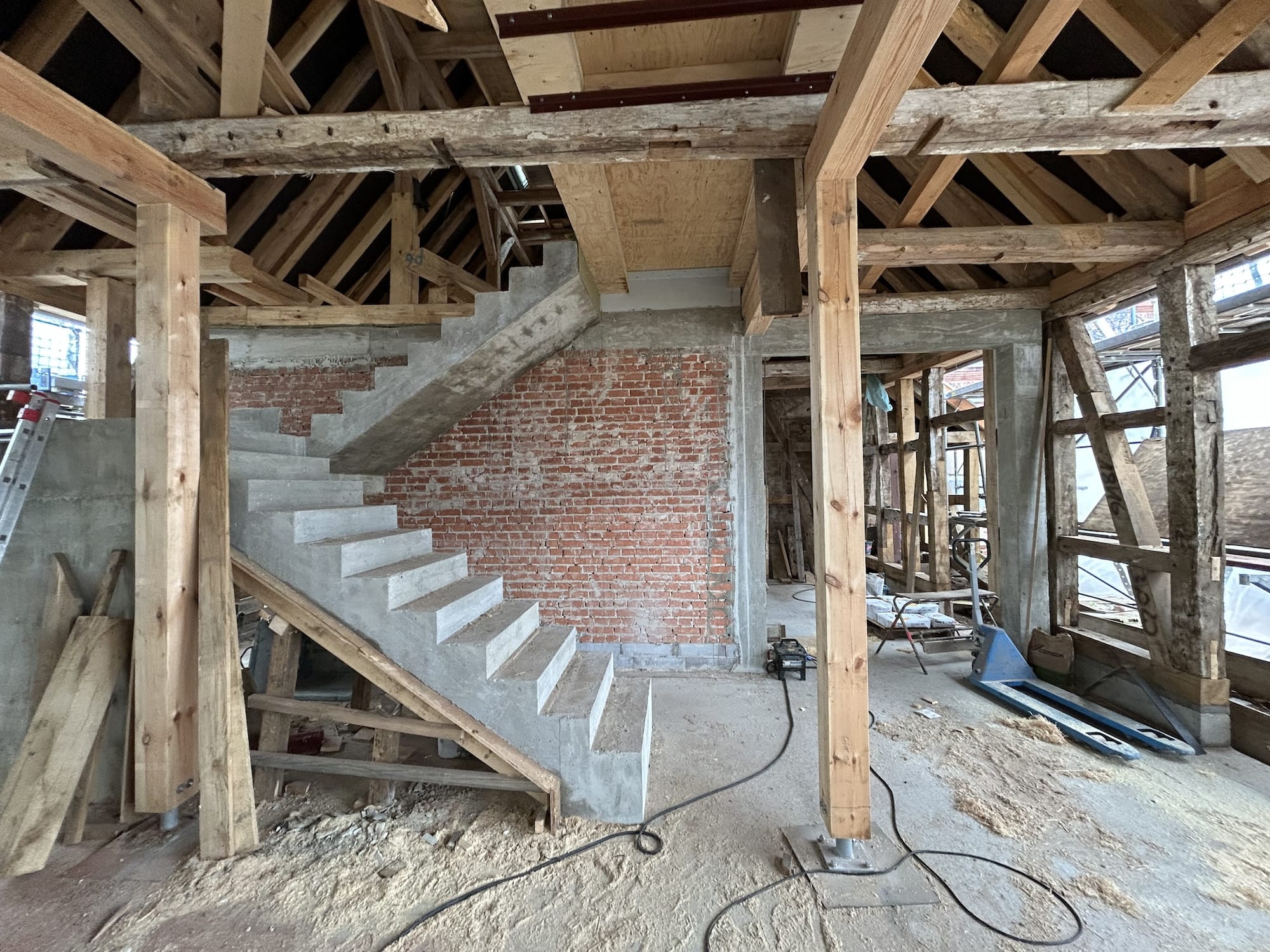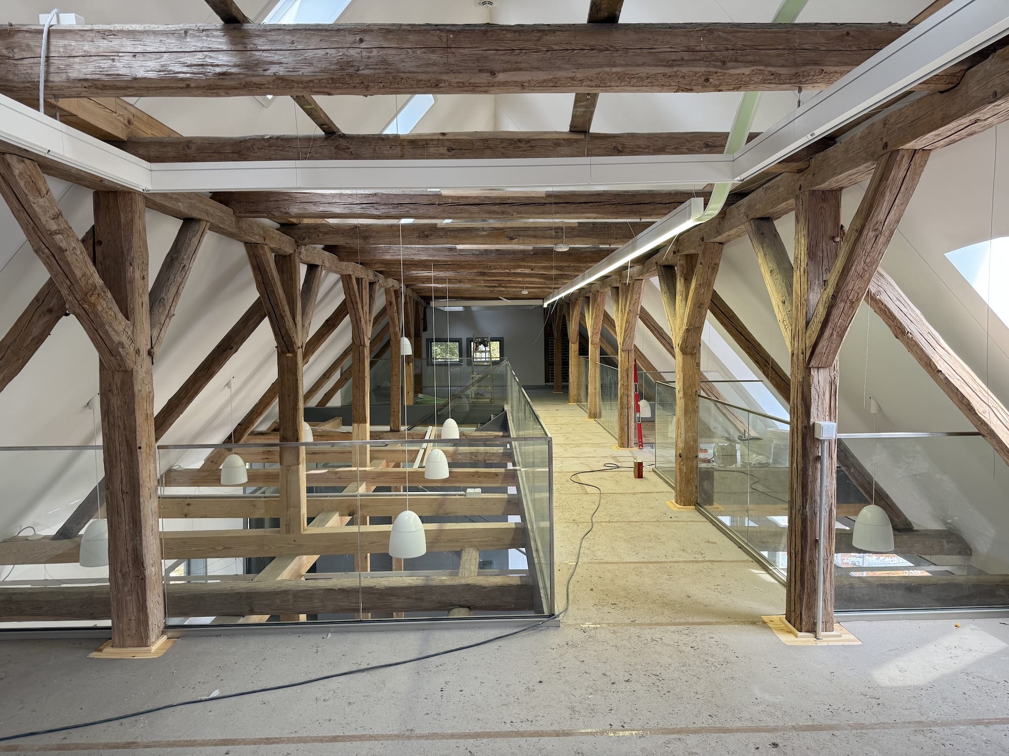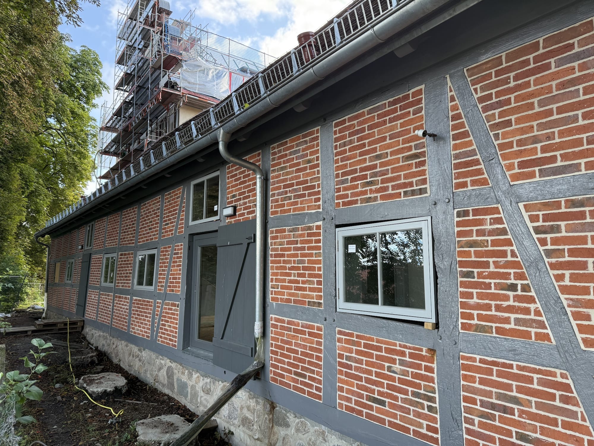 Vor Beginn der Bauarbeiten waren aufwändige statische Absteifungen der vorhandenen Fachwerkkonstruktionen, der Decke und des Daches zur Durchführung der Sanierungsmaßnahme mit einer separaten Gründung notwendig.