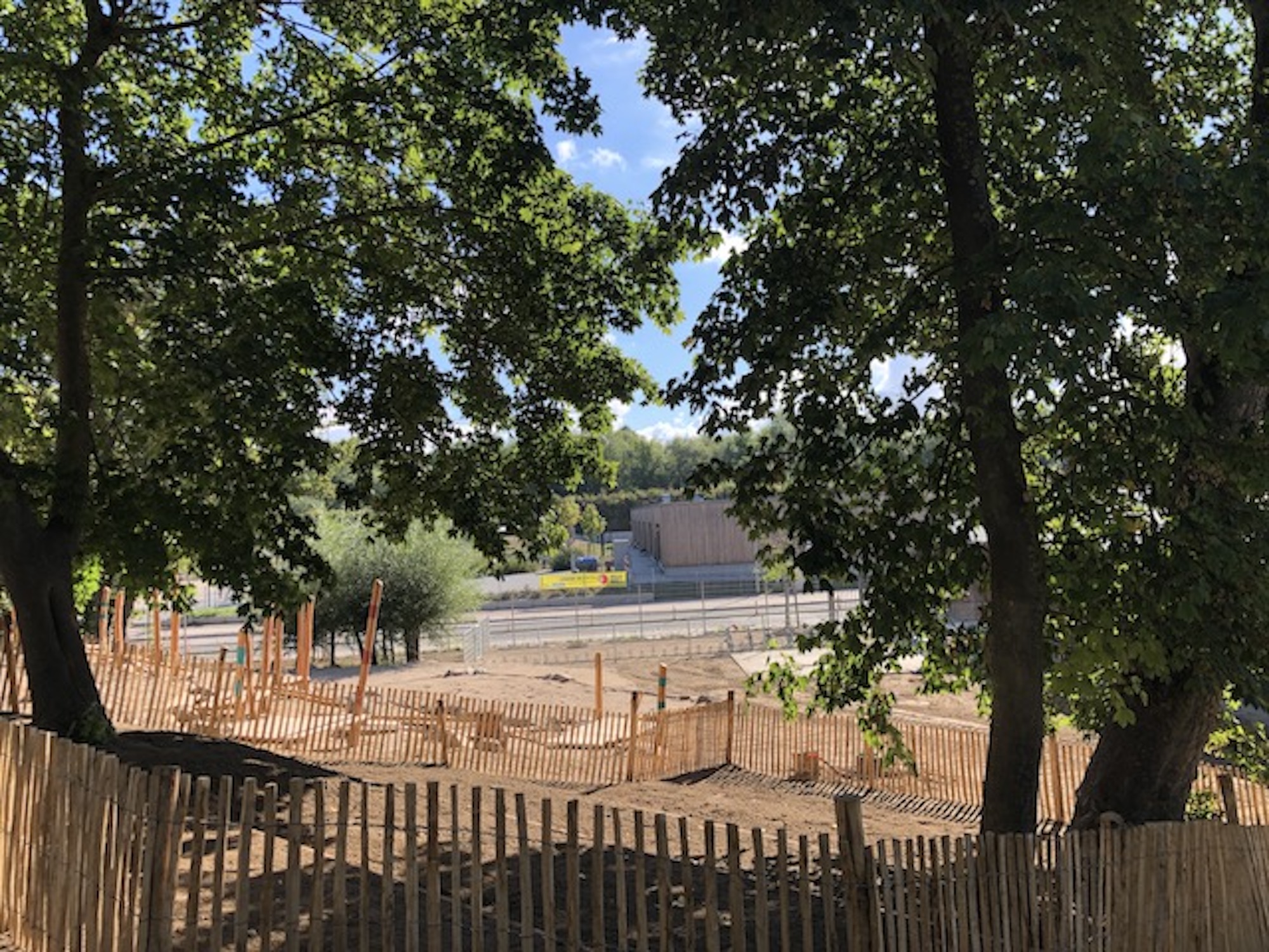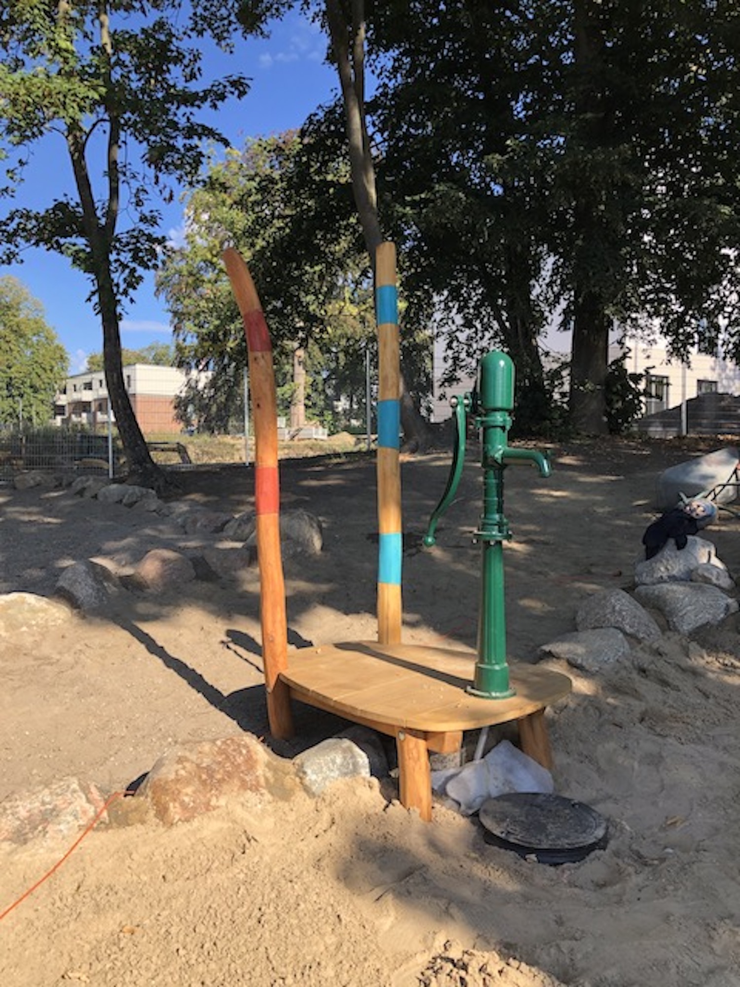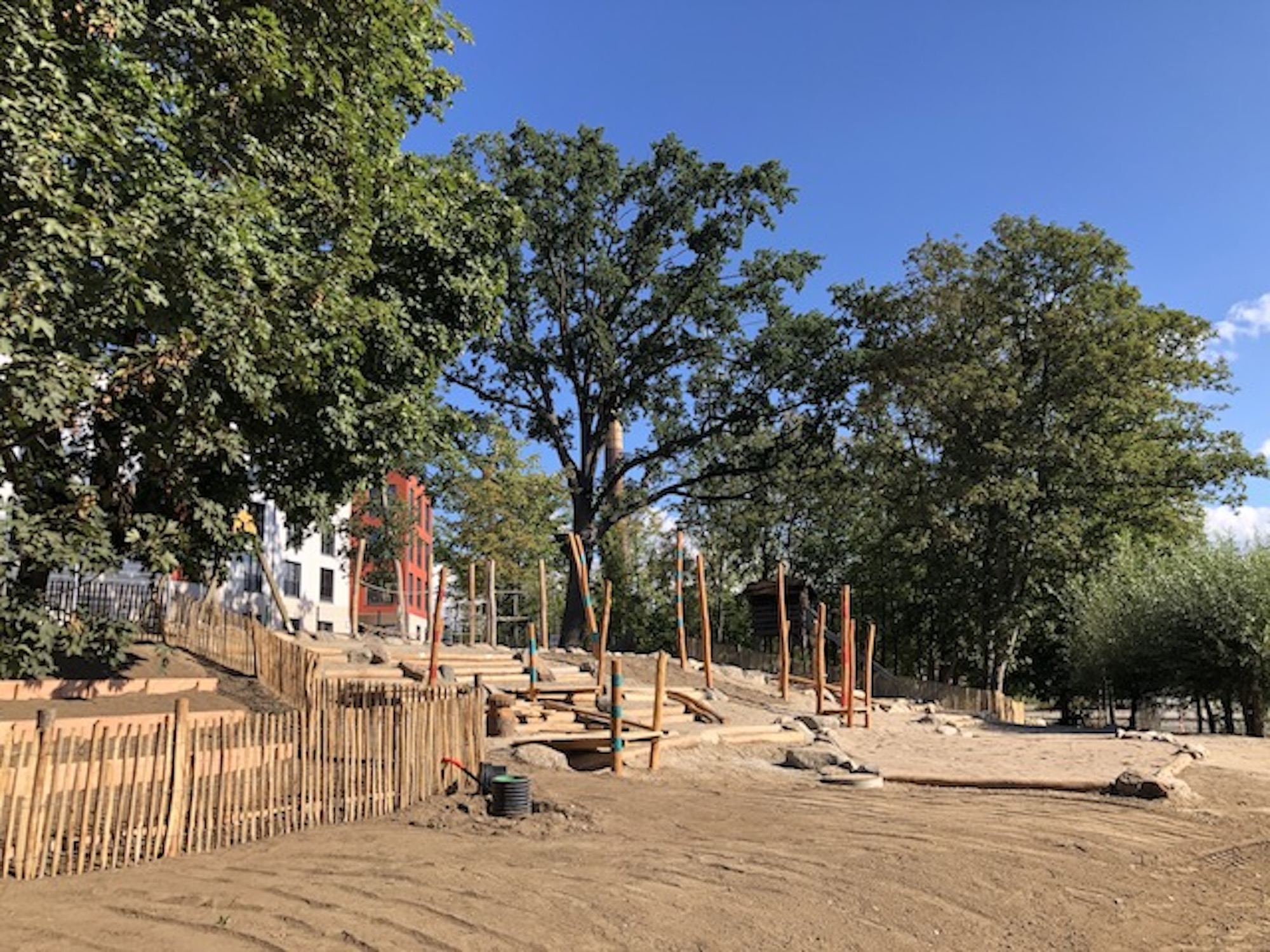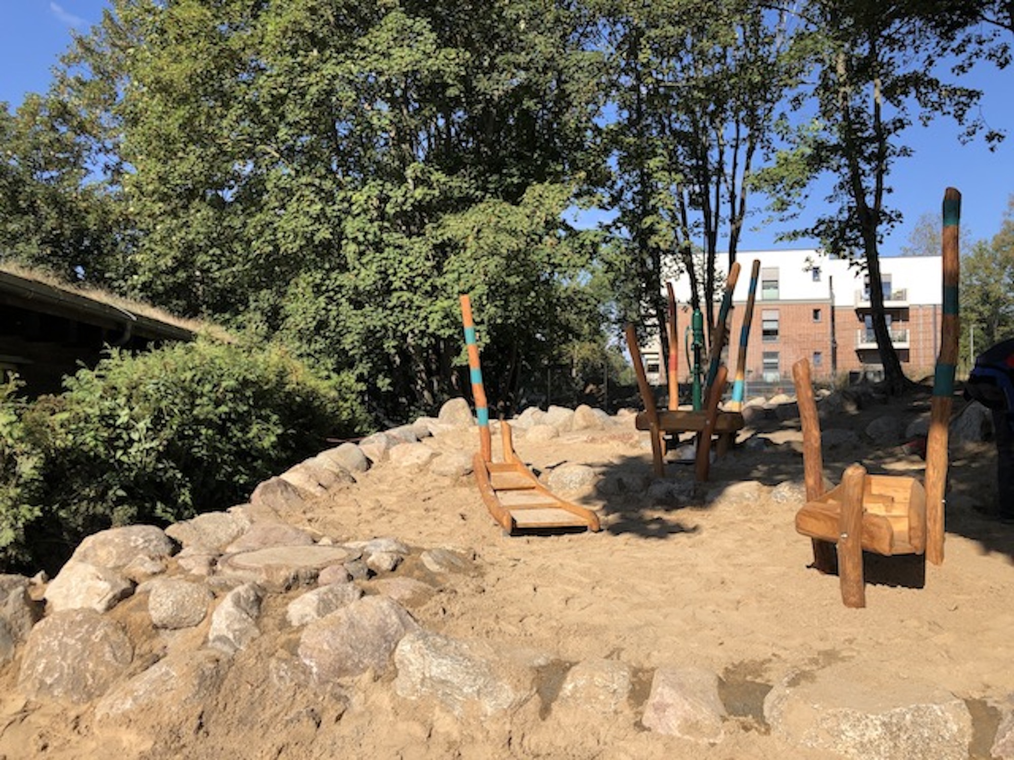 Das Aussengelände des Hortes besteht zu 80% aus einem grossen Hang. Das Gelände war abgewirtschaftet und zerspielt. Die Neugestaltung umfasste die Befestigung des Hangbereiches, die Schaffung neuer Spielbereiche, Fahrradabstellanlagen und Bepflanzungszonen, die nicht bespielt werden können. Unter der Federführung der Landschaftsarchitekten Adolphi+Rose ist diese schwierige Aufgabe der Neugestaltung eines hangigen Spielgeländes für über 200 Kinder sehr gut gelungen.