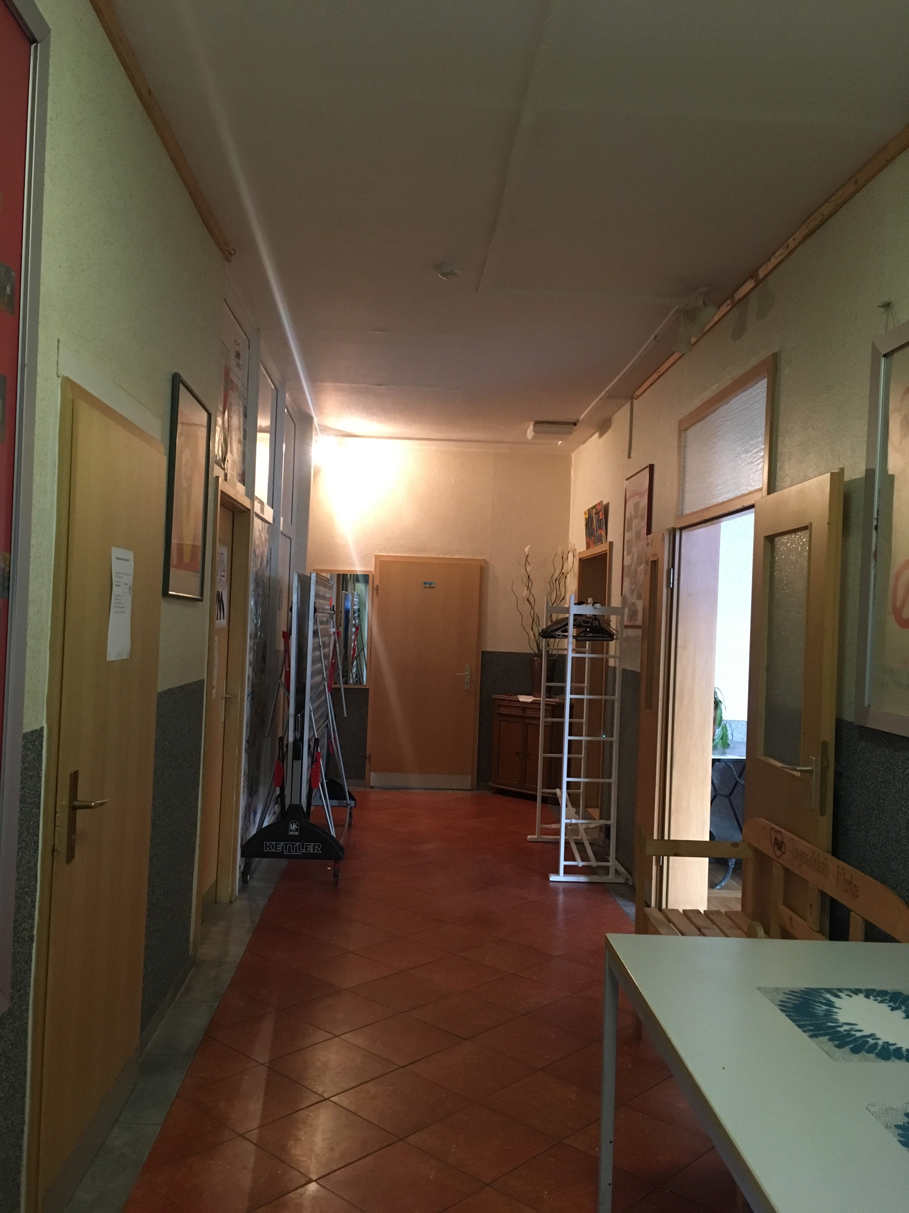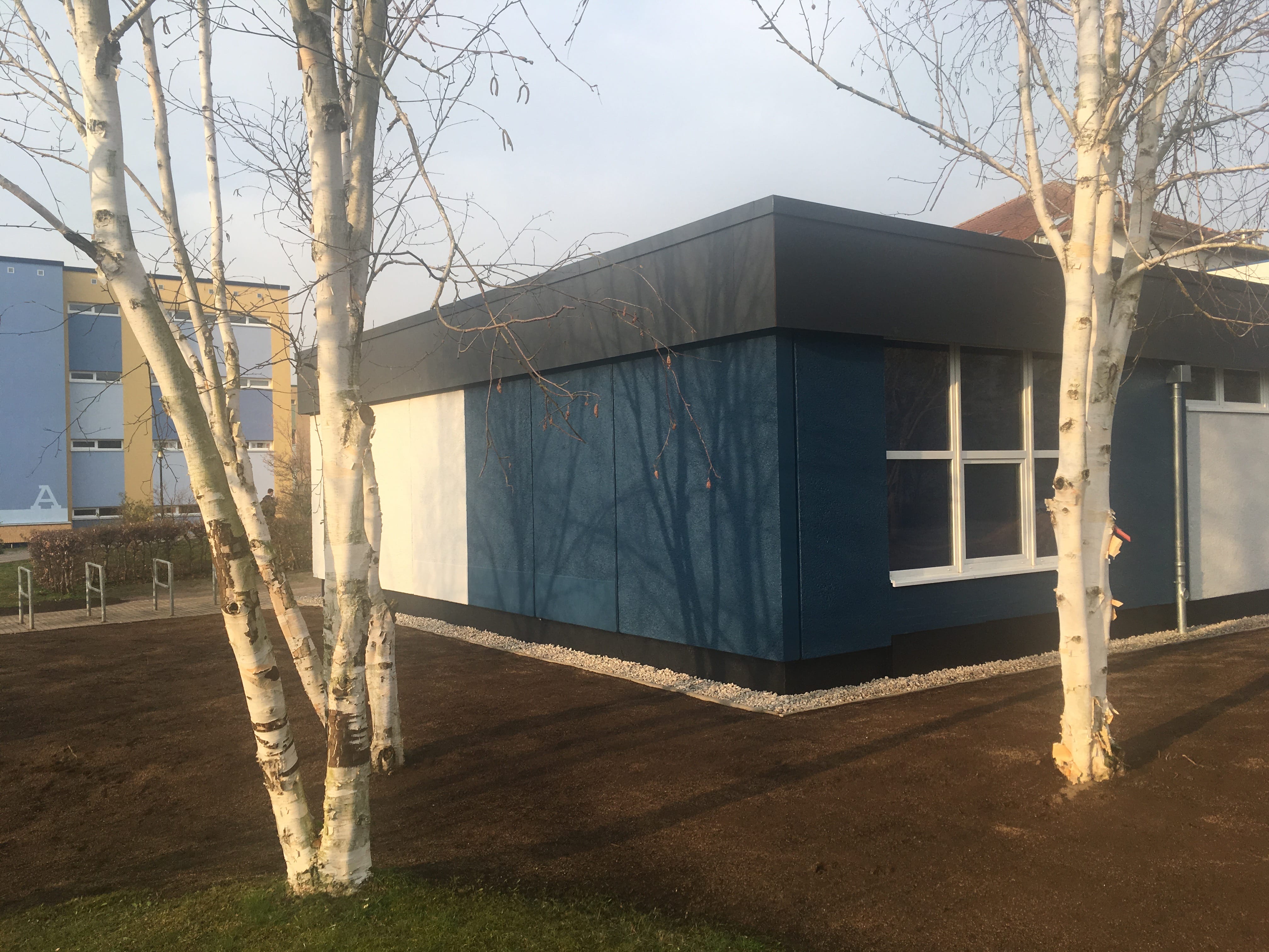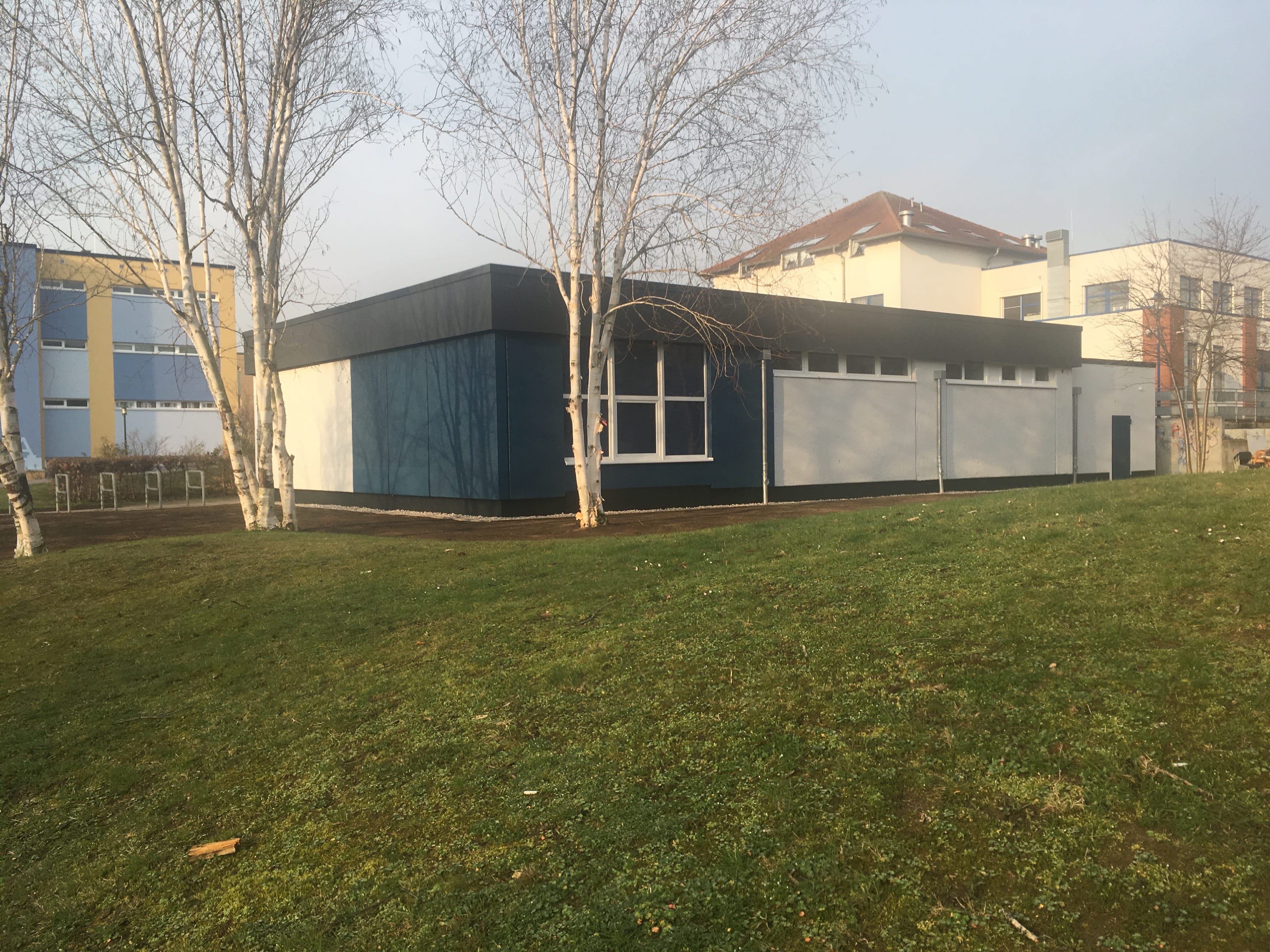 Die Fassade bestand 2017 aus einer komplett graffitiverzierten Oberfläche. Das Gebäude war von zwei Seiten komplett eingewachsen und allen Fenster vergittert. Auch die Fassade erhielt eine Grundsanierung. Die Fenster wurden freigelegt, die Aussenanlagen komplett zurückgeschnitten und neu angelegt und die Fassaden erhielten ein völlig neues Gesicht. Das neue Gebäude erstrahlt in einer freundlichen, schlichteleganten Farbgebung, die sich in die Umgebung der Wohnbebauungen eingefügt. Als strahlender Punkt wurde der Eingang in einem strahlenden Orange gestrichen und lädt nun mit neuen Glanz die Jugendlichen zu gemeinsamen Aufenthalten, Feiern und vielen guten Gesprächen ins komplett sanierte Gebäude ein.