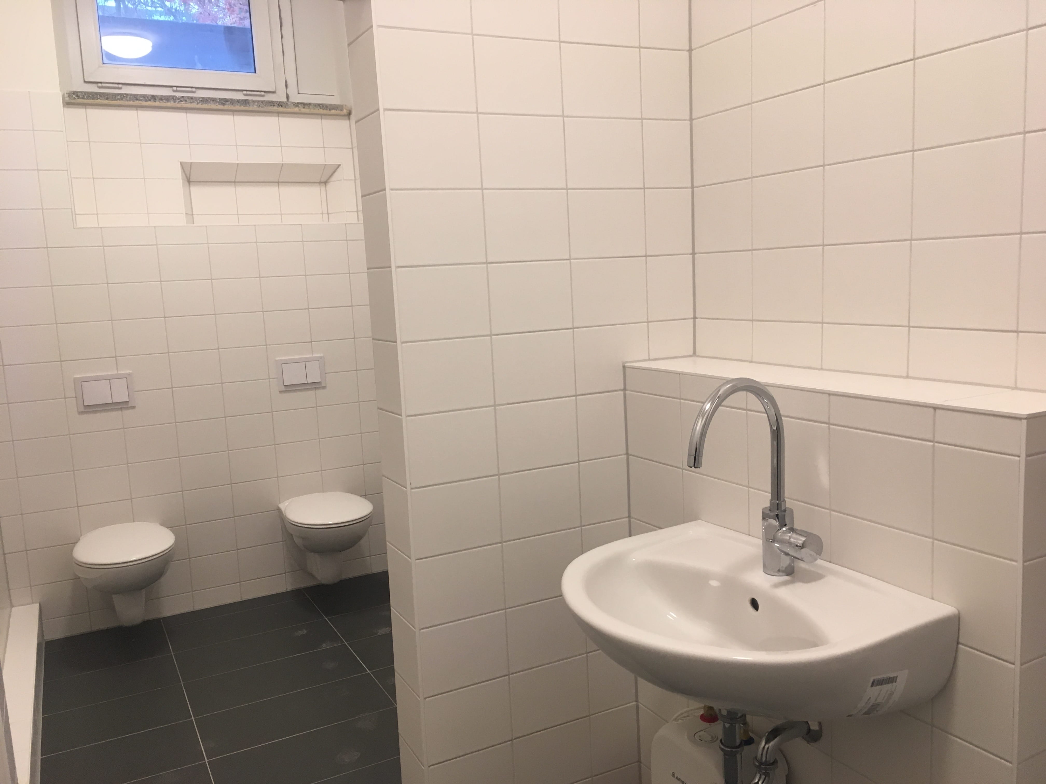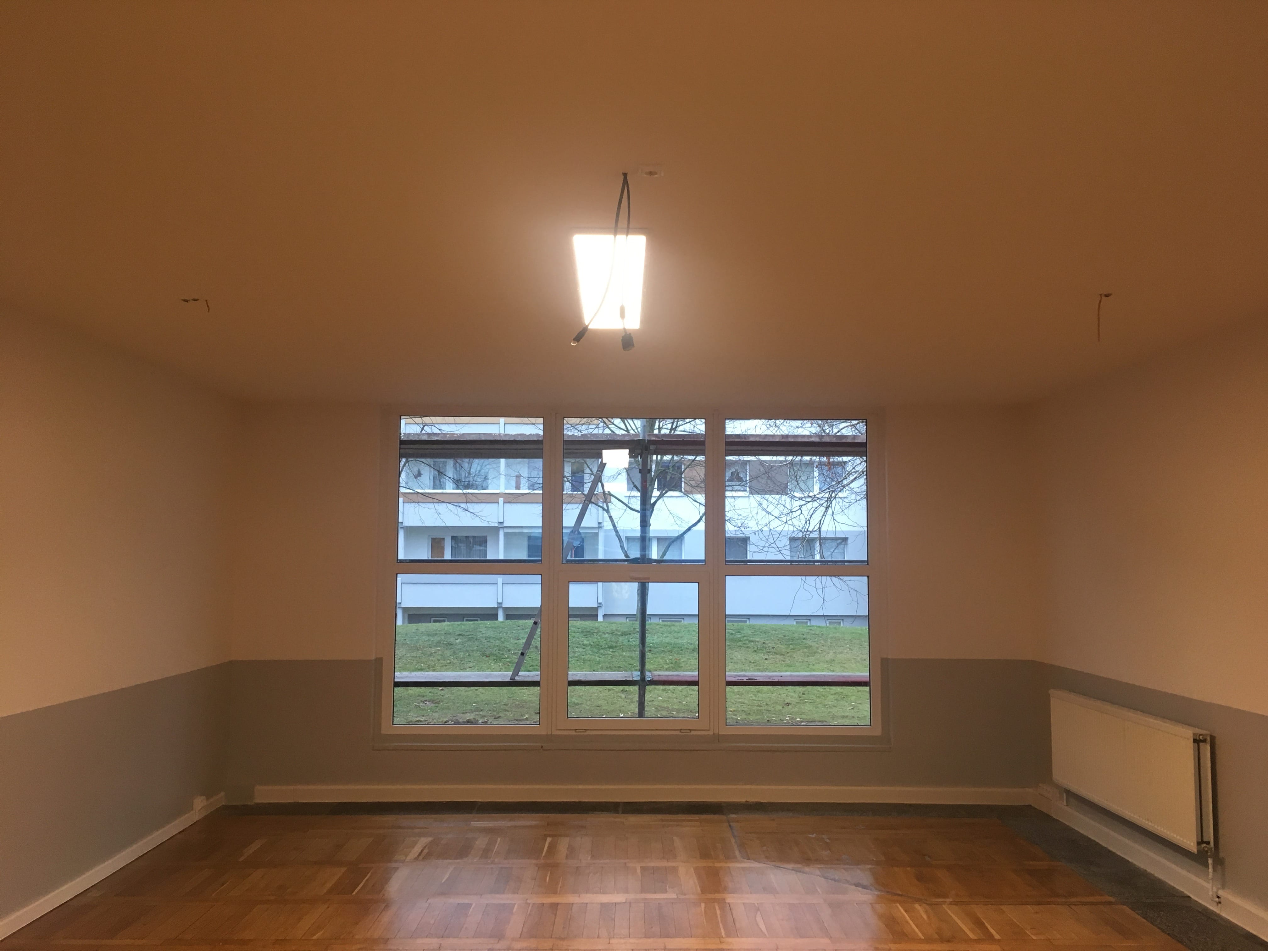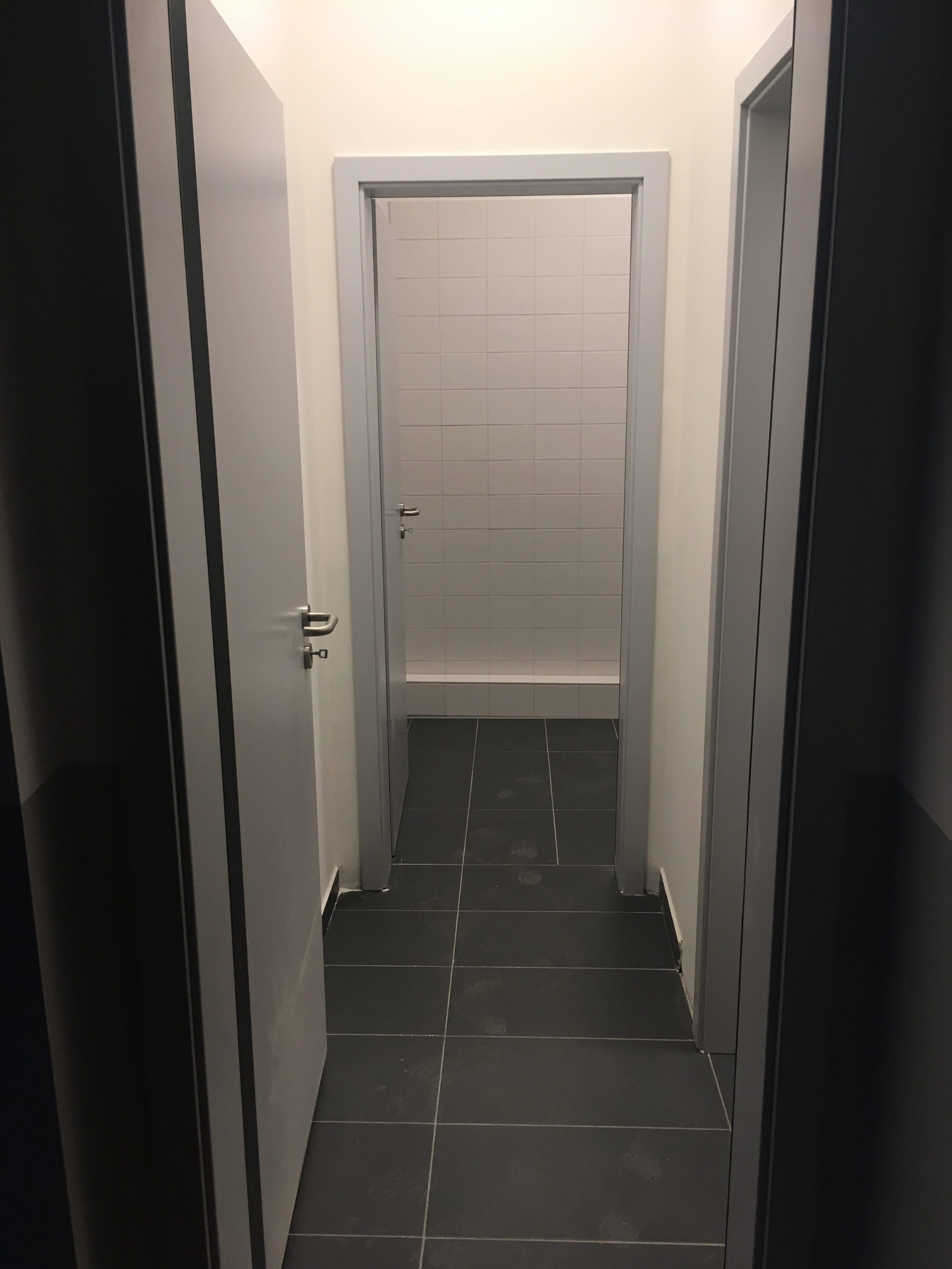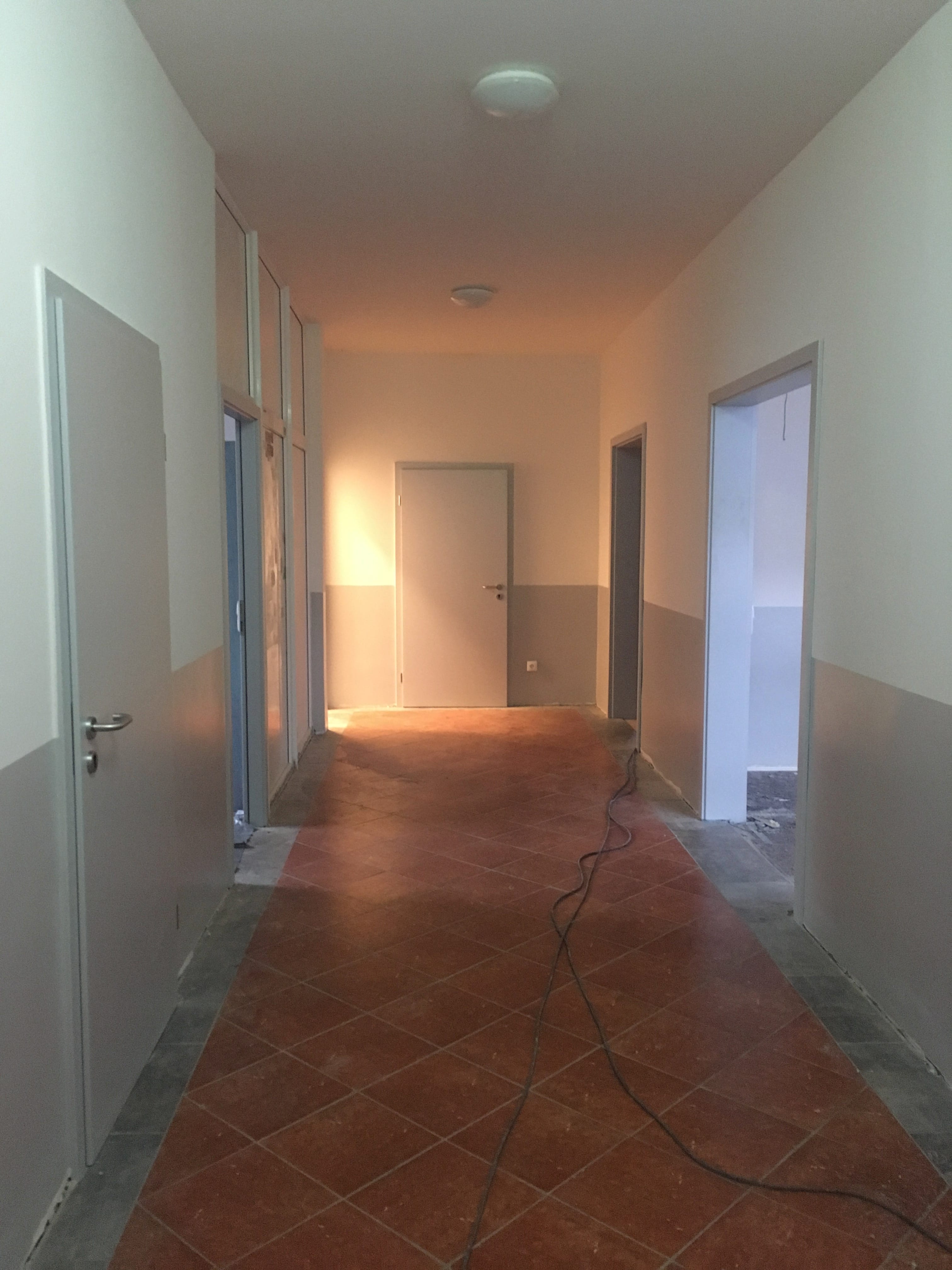 Im Innenraum wurden sämtliche Ausbauten bis auf die bestehenden Terrazzo- und Holzböden erneuert. Das Gebäude hatte in den vergangenen Jahrzehnten verschiedenste Tapetenausführungen und Farbanstriche erfahren, die nur aufeinandergeschichtet, aber nie grunderneuert wurden. Eine komplette Entkernung und grundlegende Sanierung der Decken , Wände und auch der Sanitäreinheiten war unumgänglich.