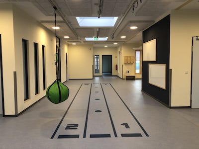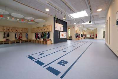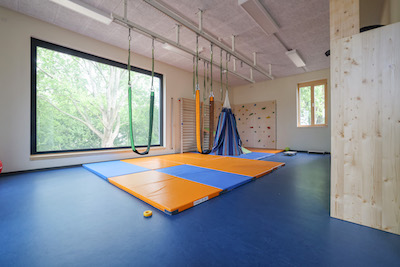 Die Ausrichtung Sport ist eine Besonderheit in der Kita-Landschaft der Hansestadt Wismar. Es sind Kooperationsverträge mit ansässigen Sportvereinen geschlossen worden, die das Ausüben von Sport bereits im Kindesalter fördern sollen. In Zusammenarbeit mit Sportvereinen der Stadt werden individuelle Sportangebote in der Kita stattfinden. Um diese Arbeit zu unterstützen ist ein Sportraum mit einer Deckenhöhe von knapp 4,00m geschaffen worden. Sportgeräte sind an den Decken vorinstalliert. Die Flure der Kita sind breiter als üblich ausgeführt, so dass auch hier Sportangebote ausgeführt werden können. An den Decken der Flure sind ebenfalls Sportgeräte vorinstalliert. Auf den Fluren der Krippe wie auch des Kindergartens sind Rennstrecken im Boden vorbereitet, die einen Wettlauf oder ein Wettrennen mit Fahrzeugen ermöglichen. In den Aussenlagen sind ein Kletterhang sowie eine Rennstrecke in der Hanglage integriert worden. Das Gesamtkonzept zur Förderung der Bewegung und des Sports bei Kindern ab 1 Jahr sind im Gebäude und in den Aussenanlagen wiederzuerkennen.