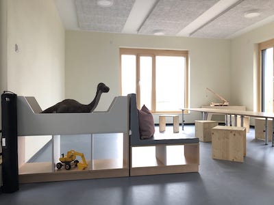 Um die benötigten Flächen zur Umsetzung der Konzeption schaffen zu können, ist diese Kita knapp 300 qm grösser hergerichtet worden als eine vergleichbare Standard-Kita. Dieses besondere Konzept bereichert die Vielfalt der Kitas in der Hansestadt Wismar und vervollständigt eine bereits gut ausgestattete Kita-Vielfalt.