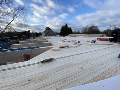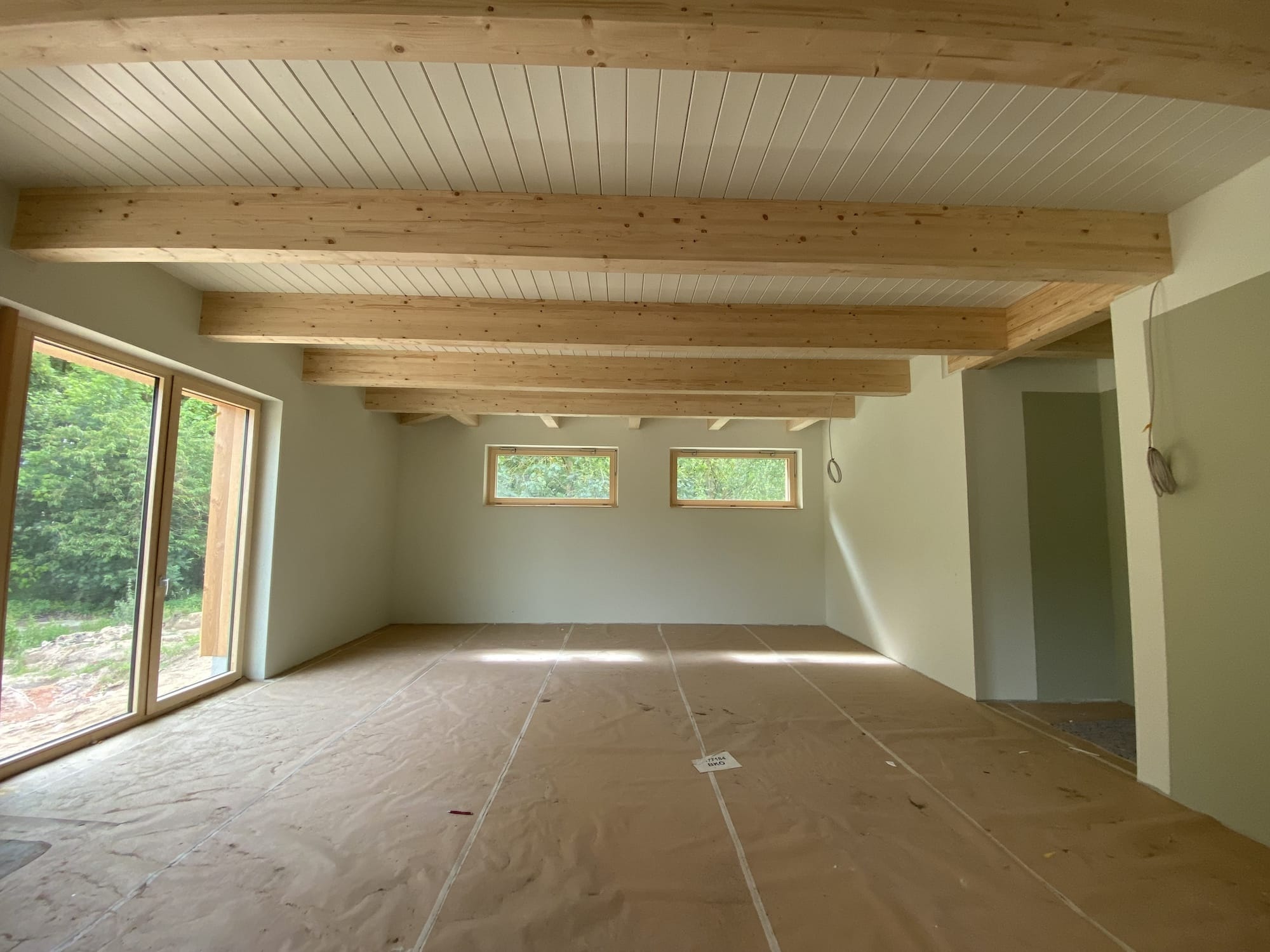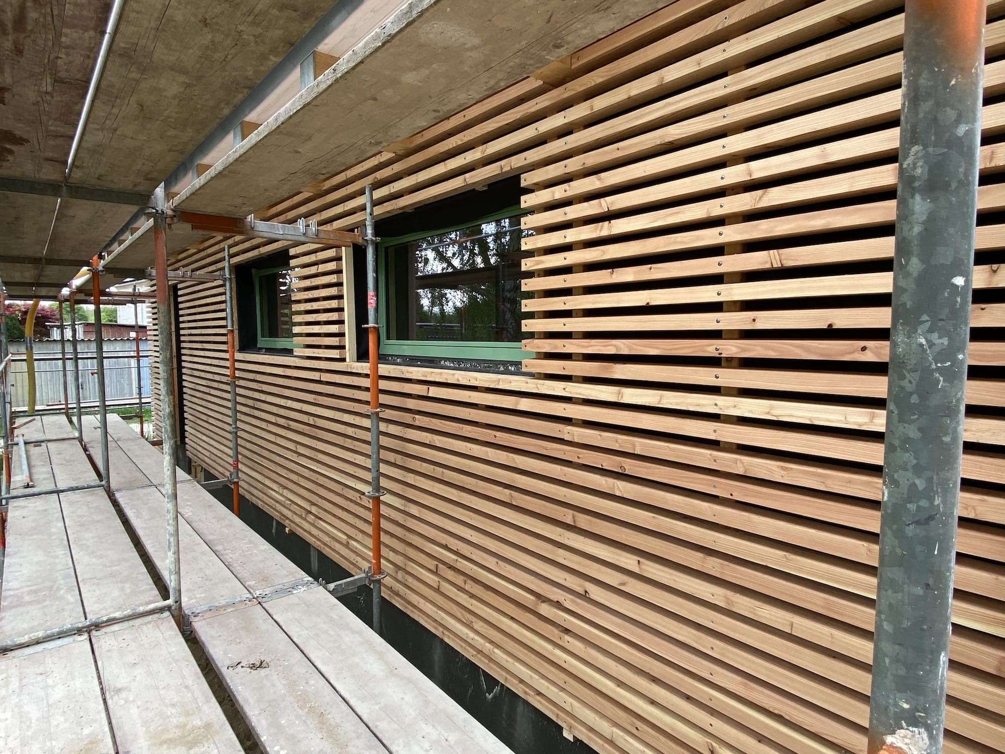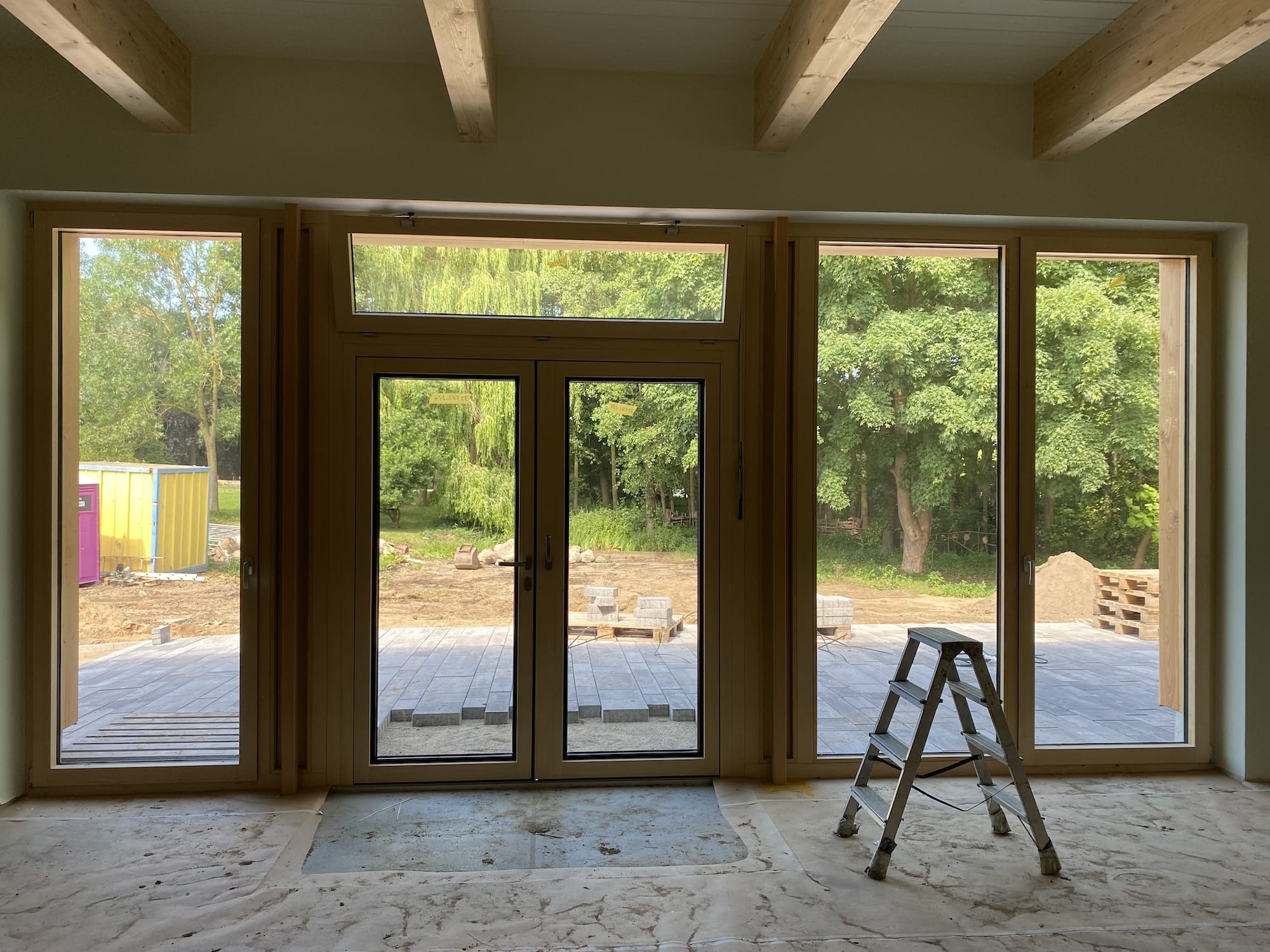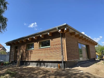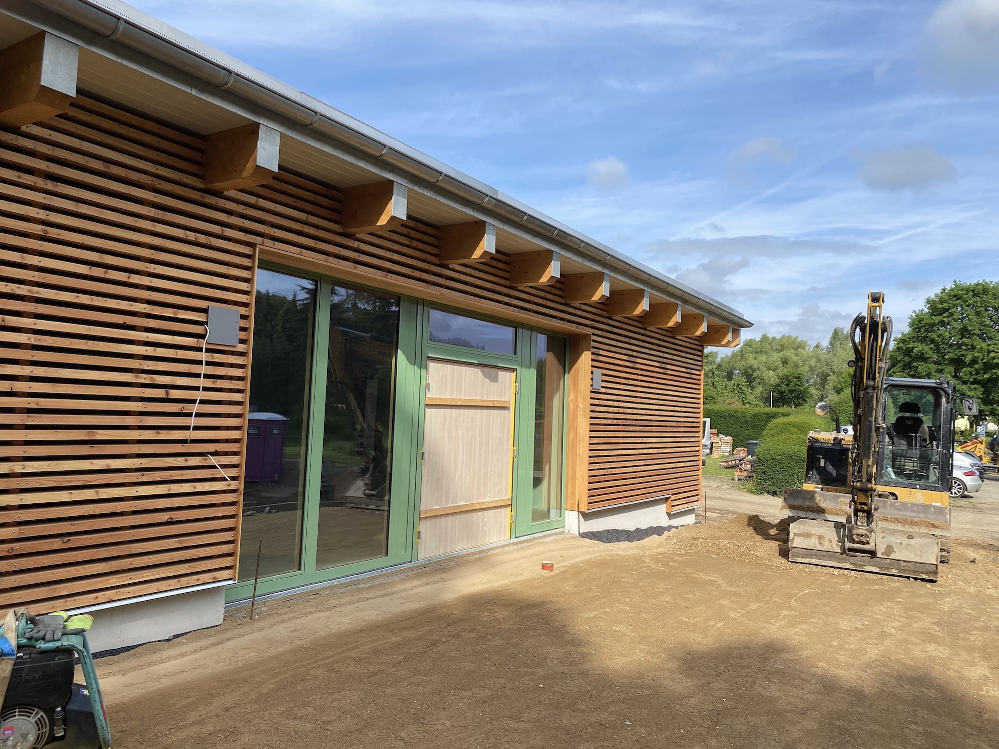 Durch die auskragenden Dachbalken aus Brettschichtholz und große Glaselemente entstehen Sichtachsen und eine Verbindung mit dem anschließenden Gartengelände, dem Wald und dem Mühlenteich. Das optische Einfügen des Gebäudes in die Landschaft wird durch die Holzfassade aus horizontalen Rhombuslamellen, Holzfenstern und das extensive Gründach erreicht. Die tragenden Wandkonstruktionen sind massiv aus Ziegeln ausgeführt. Die Gründung erfolgt über eine Stahlbetonbodenplatte mit Frostschürzen.