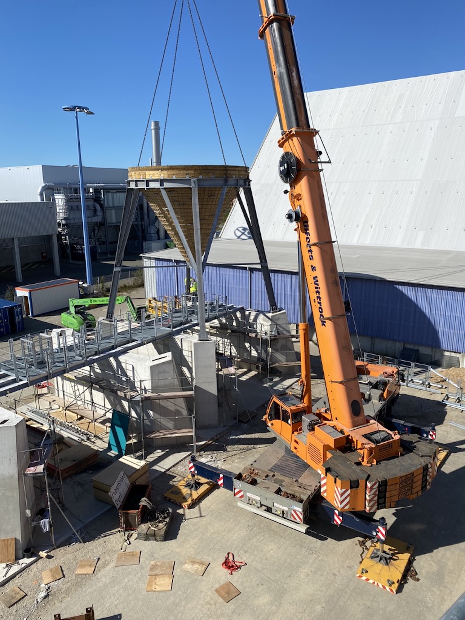 Der feuerverzinkte Stahlunterbau ruht auf jeweils zwei Stahlbeton-Wangen einer gemeinsamen Stahlbeton-Sohlplatte. Diese sind gegründet auf 30 Teilverdrängungsbohrpfählen.
